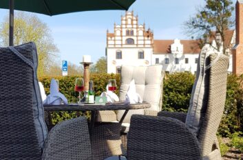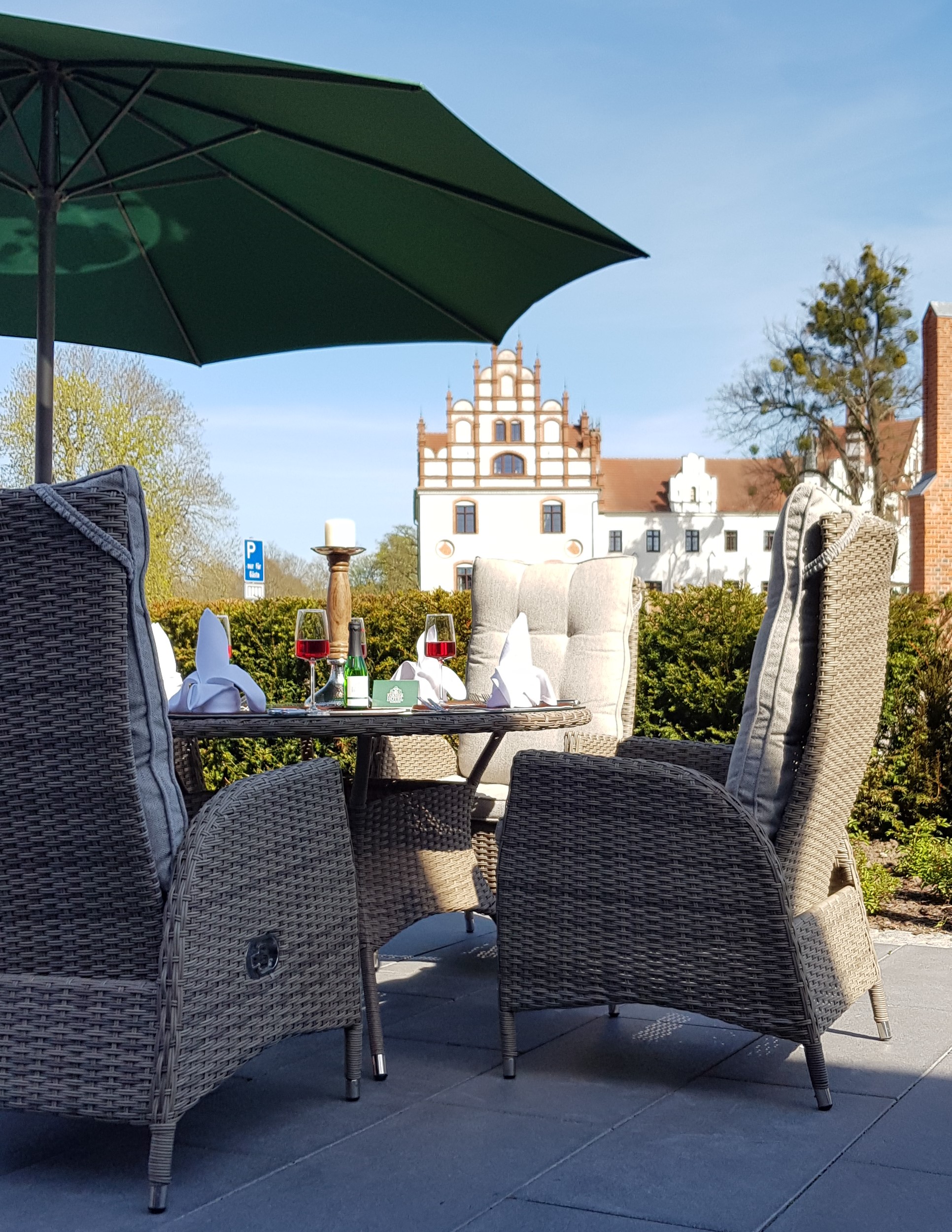 DAS KRANICH – idyllisch und ruhig gelegen, mit Blick auf das Schloss Basedow. Eine großzügige Terrasse in gelassener Atmosphäre lädt zum Verweilen ein.